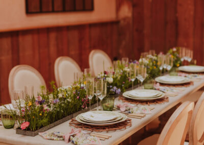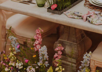 The tablescape featured rattan chargers, layered with green patterned plates and coloured glassware, all to echo our wildflower theme. The effect was organic, elegant, and effortless.