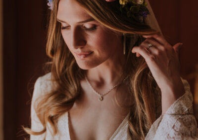 Boho & Ethereal (Dress): Dewy, glowing skin with peachy tones and relaxed waves to complement the wildflower crown and full-length veil.