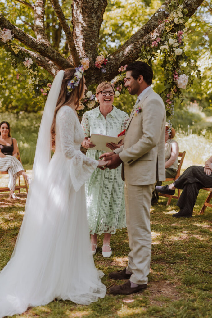 I’m a celebrant based in Oxfordshire @bluebell.celebrant, and for this shoot, I really wanted to highlight the beauty and freedom of an outdoor wedding ceremony. In keeping with our nature-inspired theme, we chose a woodland setting with the seating arranged in a circle to create a relaxed and inclusive atmosphere. I created a bespoke celebration that featured unique moments like a quaich (a double handed cup, symbolising unity) and a cocktail shake (representing the ingredients of a strong marriage), bringing personality and meaning to the experience.