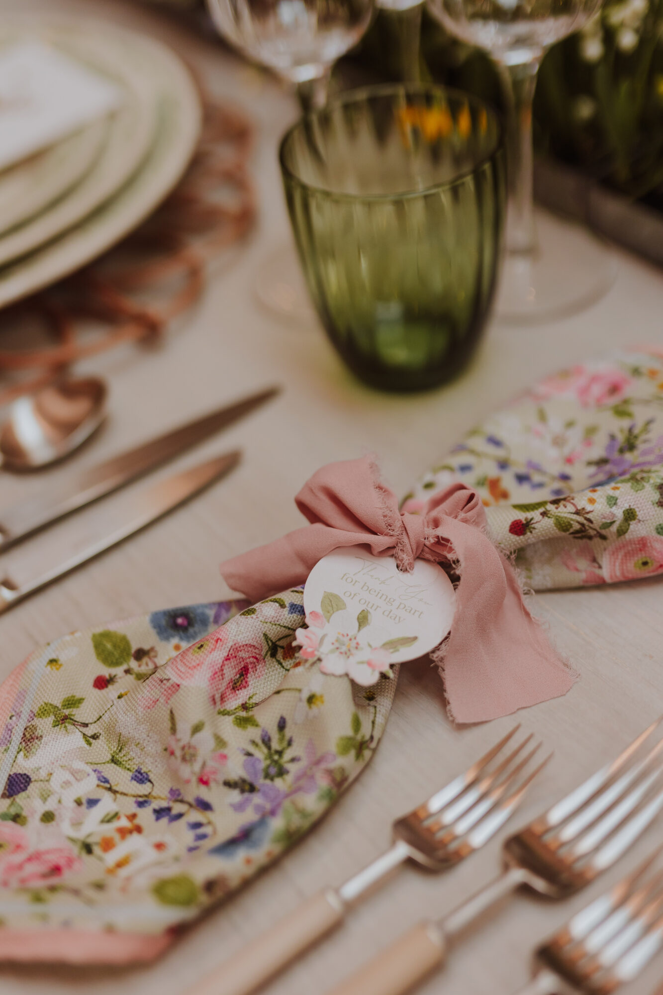 Watercolour artist @annajaynedesigns used native plants — like apple blossom and strawberry flowers — as the basis for a beautiful pastel palette. Personalised napkin favours, doubled as place settings and mementos for guests to take home.