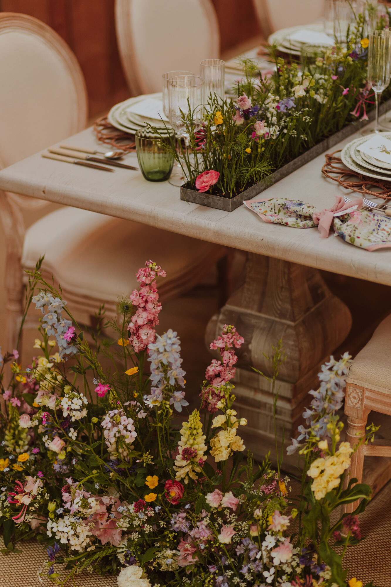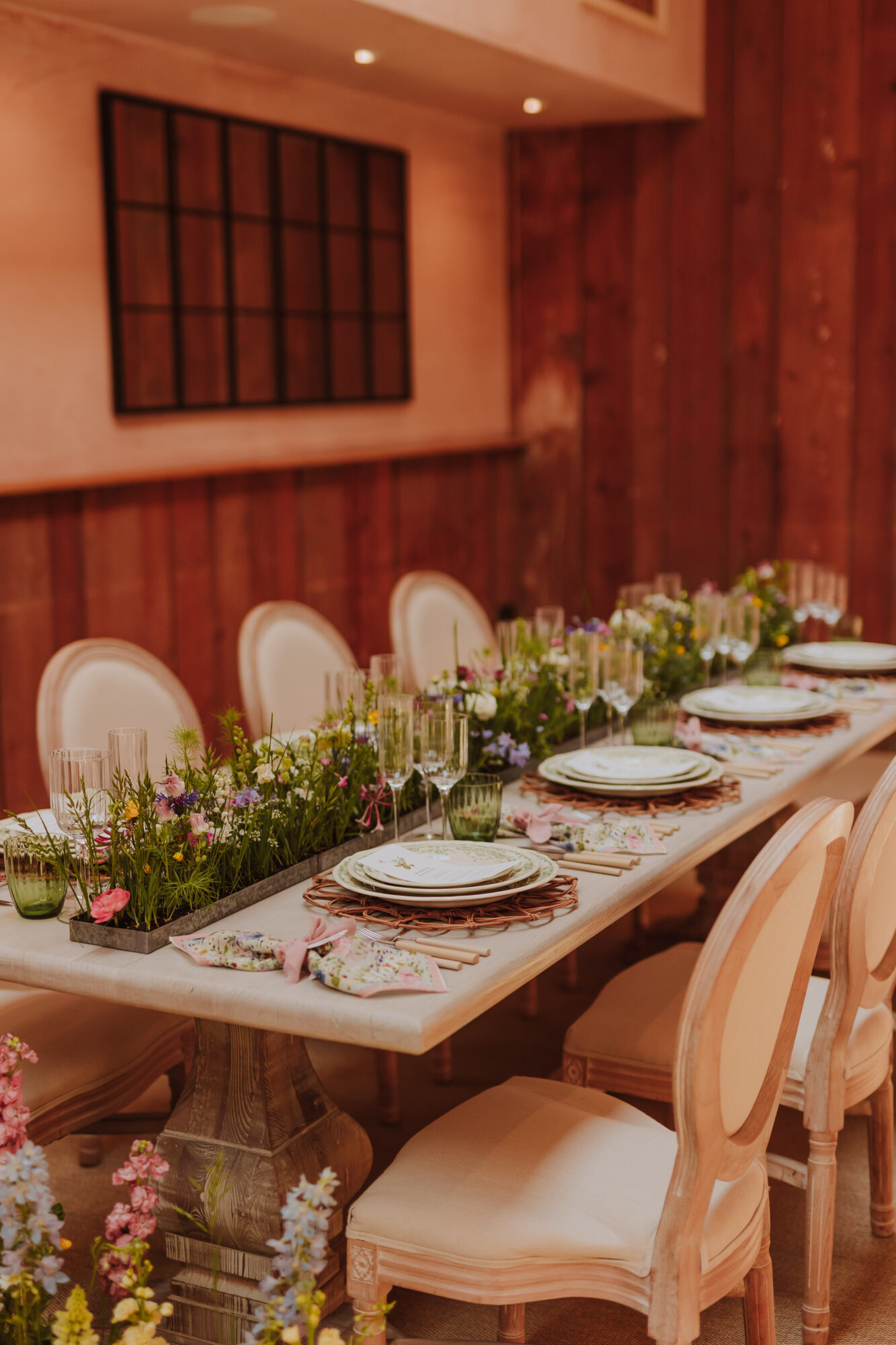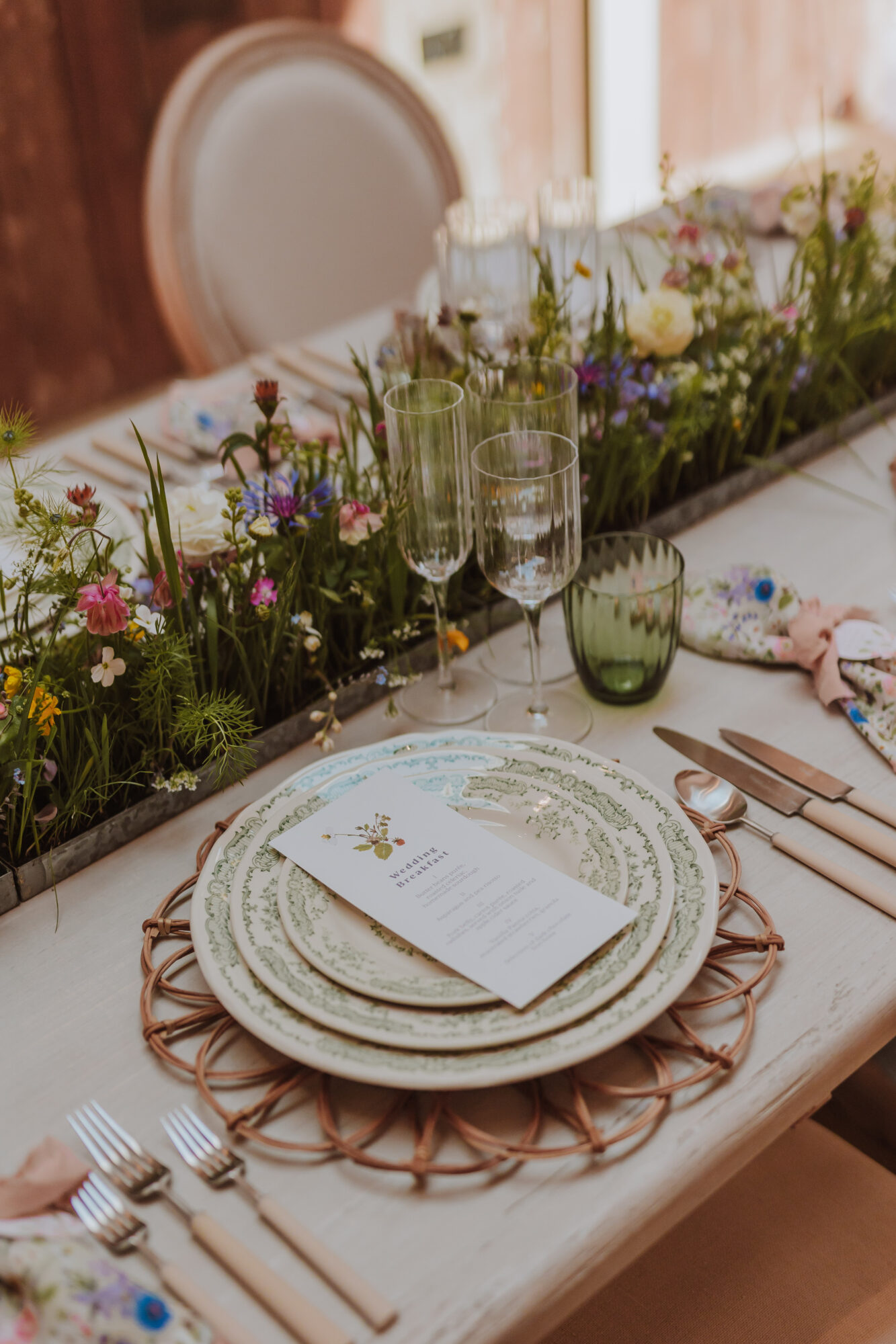 The tablescape featured rattan chargers, layered with green patterned plates and coloured glassware, all to echo our wildflower theme. The effect was organic, elegant, and effortless.