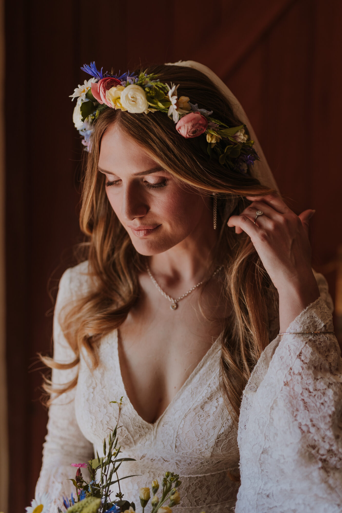 Boho & Ethereal (Dress): Dewy, glowing skin with peachy tones and relaxed waves to complement the wildflower crown and full-length veil.