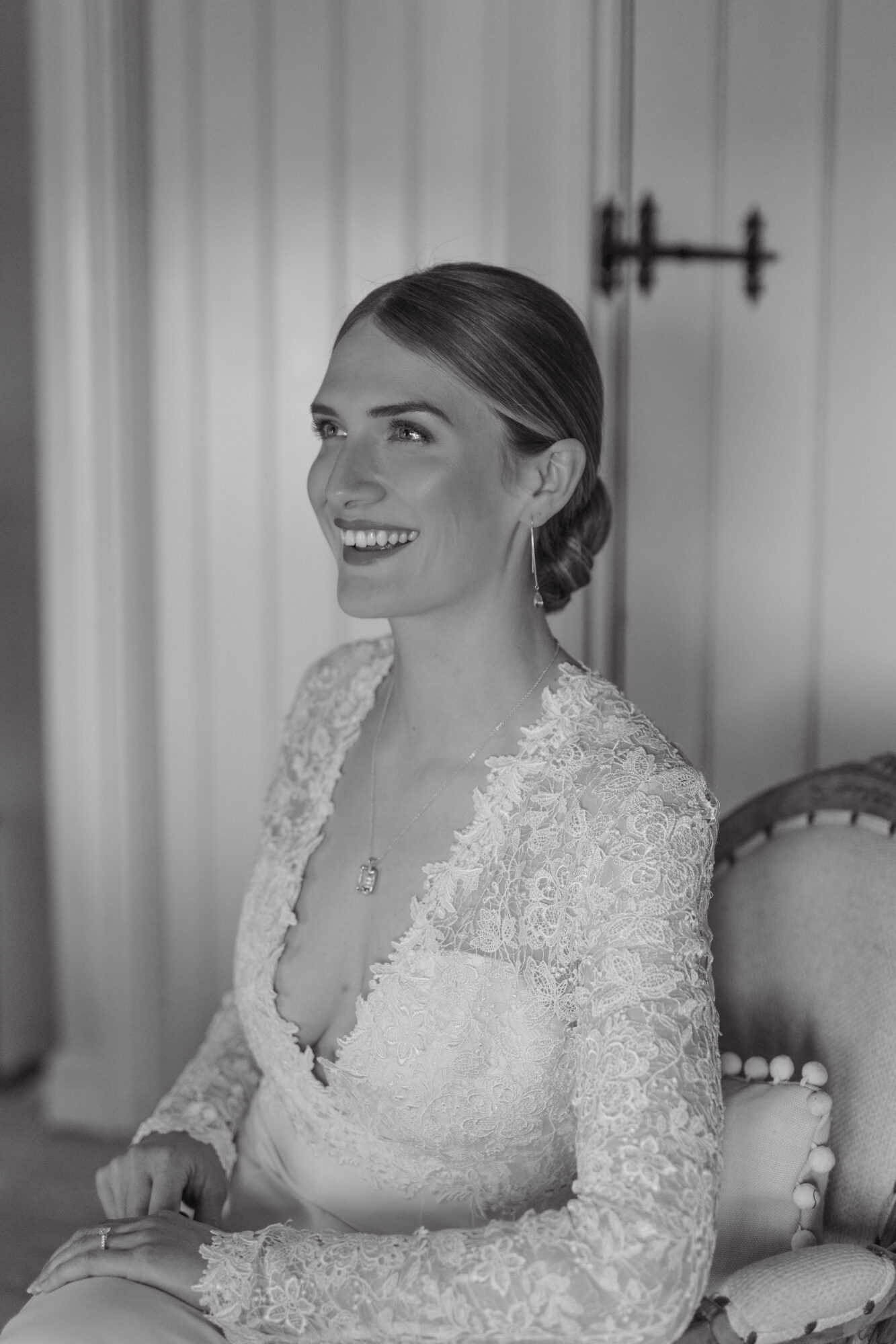 Modern & Polished (Jumpsuit): Fresh, radiant skin with a sculpted finish and a sleek low bun by @elizabethjaneweddinghair and @sarahevansmakeup.